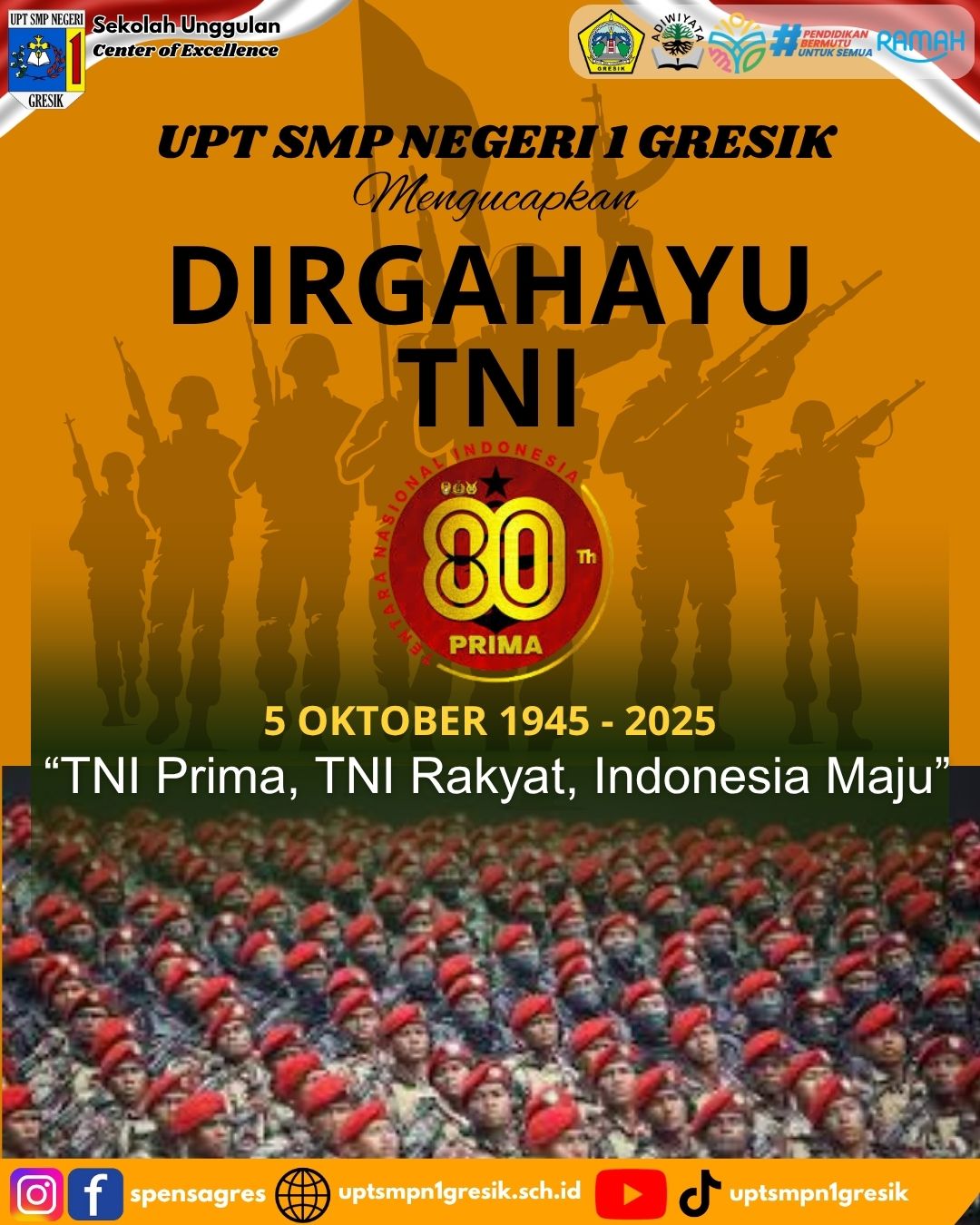 UPT SMP Negeri 1 Gresik mengucapkan Dirgahayu Tentara Nasional Indonesia (TNI) ke-80. TNI Prima, TNI Rakyat, Indonesia Maju.