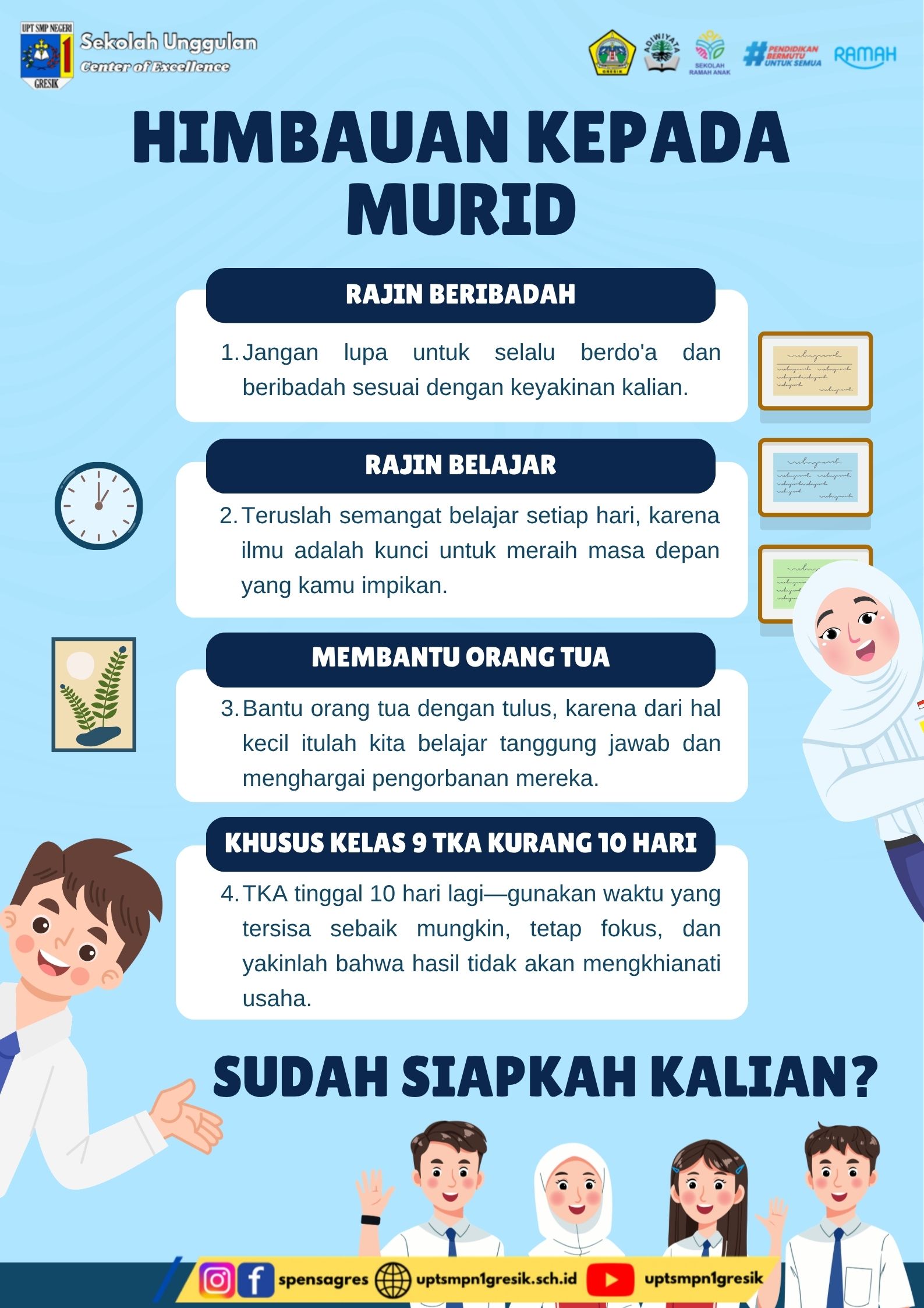 Khusus untuk murid kelas 9, satu hal yang sangat penting yakni TKA KURANG 10 HARI LAGI. Jadi persiapkan diri kalian dengan belajar yang rajin ya. Sudah siapkah kalian???? 📝⏳📒📚✨