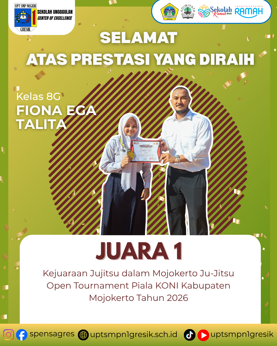 Selamat atas prestasi yang diraih oleh Murid UPT SMP NEGERI 1 GRESIK, khususnya kepada FIONA EGA TALITA (kelas 8G), sebagai peraih JUARA 1 Kejuaraan Jujitsu Putri U16 Kelas -52Kg A dalam Mojokerto Ju-Jitsu Open Tournament Piala KONI Kabupaten Mojokerto yang diselenggarakan oleh PBJI Kabupaten Mojokerto pada tanggal 16-18 Januari 2026.