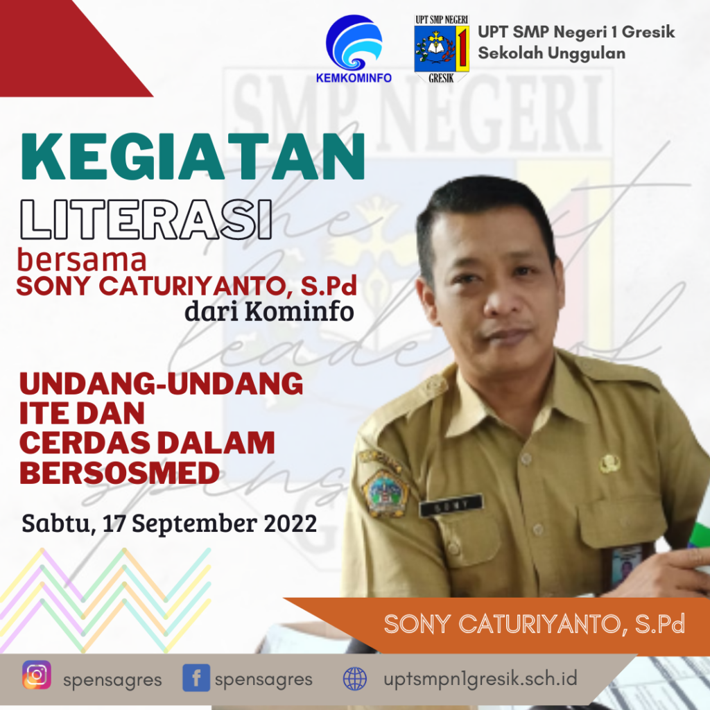 Kegiatan Literasi merupakan kegiatan pembiasaan setiap hari Sabtu yang dilaksanakan oleh UPT SMP Negeri 1 Gresik. Kegiatan Literasi pada Sabtu, 17 September 2022 akan diisi dengan Sosialisasi oleh Kominfo yang akan disampaikan oleh Bapak Sony Caturiyanto, S.Pd dengan tema Undang-Undang ITE dan Cerdas dalam Bersosmed.